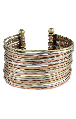 A must-have classic bracelet! This mixed multi metal bracelet features 16 lines of gold, copper and silver hammered lines bunched together in one fabulous cuff bracelet. A great day or night cuff, this hammered bracelet goes with just about everything. Covering a range of trends, including boho, classic, festival and modern, this mixed metal cuff bracelet is a great all around bracelet to have in your collection.