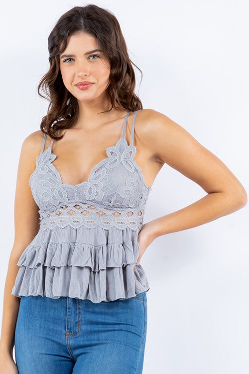 Cami lace ruffled padded tank top with adjustable straps and removable pads. Comfy and super stretchy!