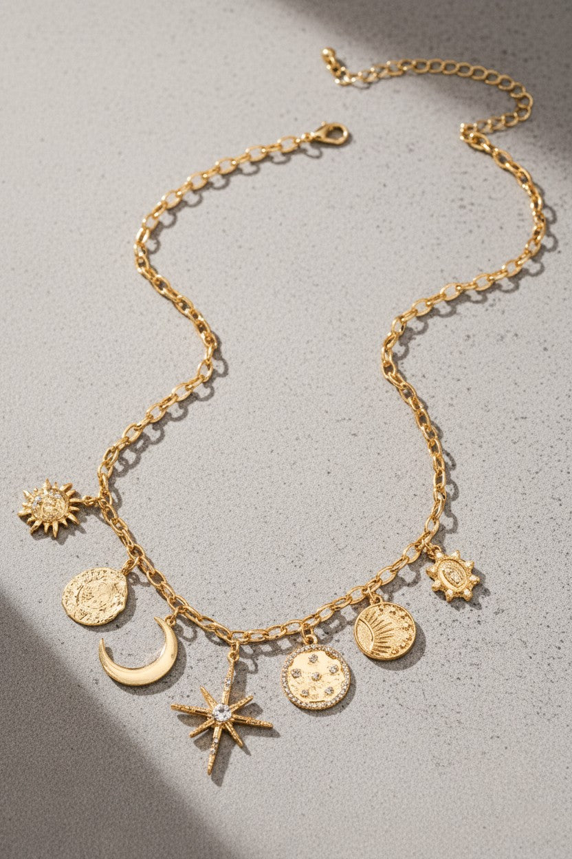 Embrace the magic of the cosmos with this celestial-themed charm necklace. Crafted in a radiant gold tone, the chain features sunbursts, moon phases, zodiac-style medallions, and a brilliant north star centerpiece adorned with a crystal accent. A perfect balance of mysticism and elegance, this piece is designed to light up your neckline!
