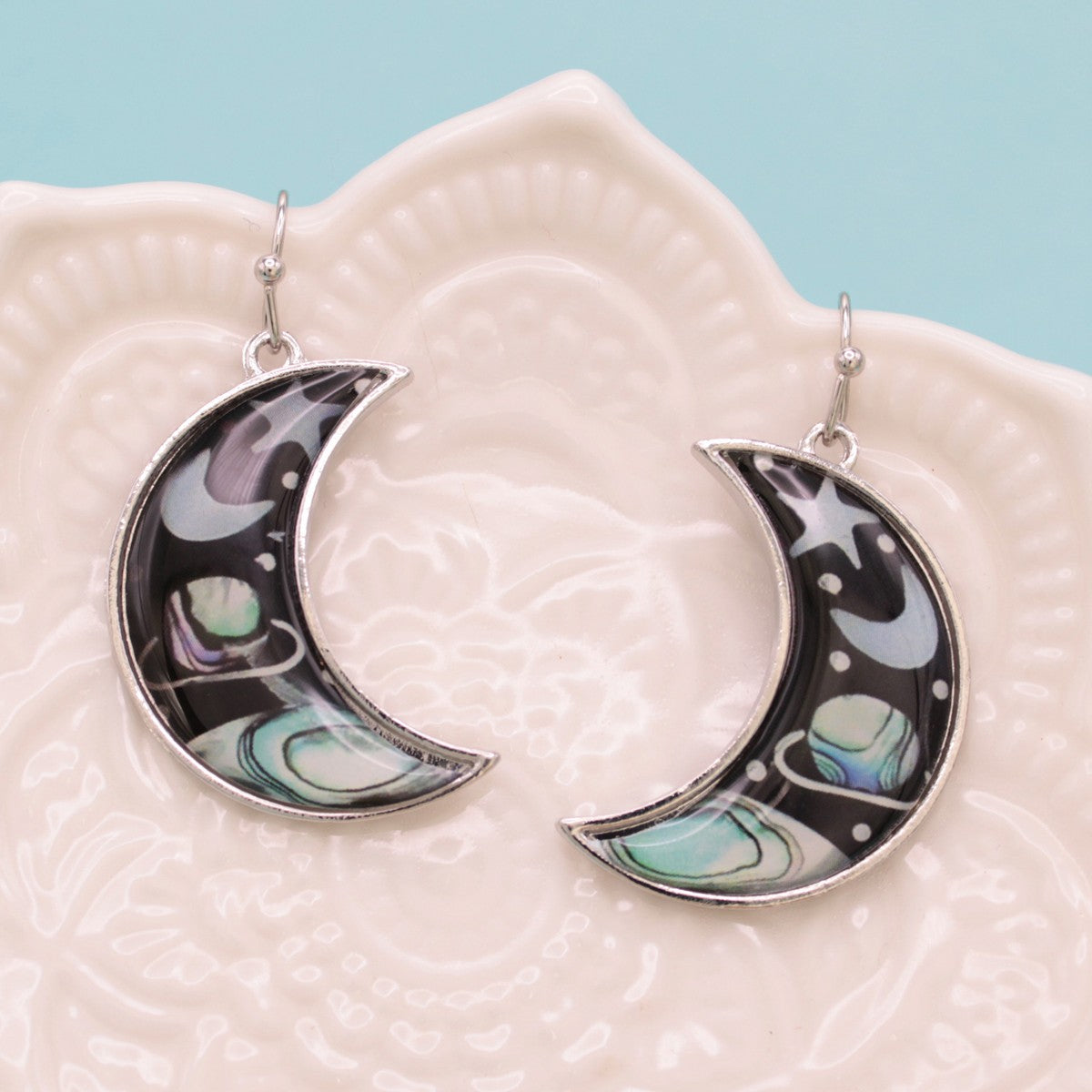 A whole universe captured in a stunning celestial accessory. These silver earrings feature an abalone shell look universe print within crescent moon, capturing the allure of galaxies and oceanic hues. Perfect for stargazers and ocean lovers alike, they bring celestial charm to your everyday style.