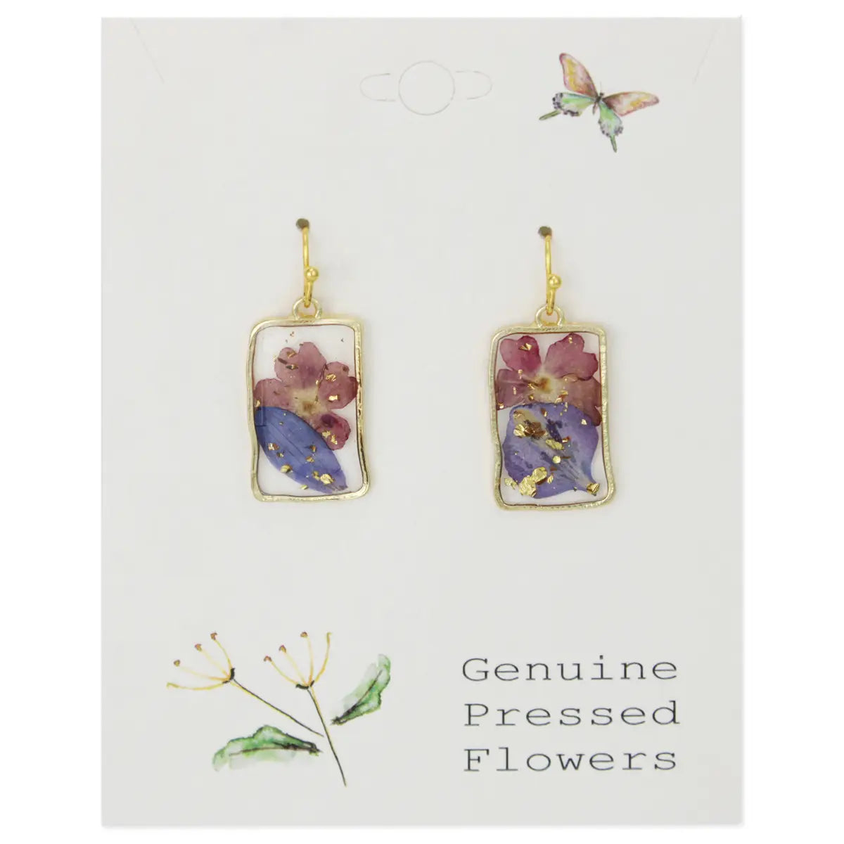 Purple Pink Dried Flower Rectangle Gold Earrings