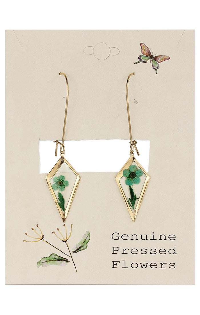 Bring home cottage style with genuine pressed flower jewelry! These gold diamond shaped earrings feature blue dried flower set in clear resin with a gold border and oversized ear wire. Natural and elegant design with dainty dried flower.