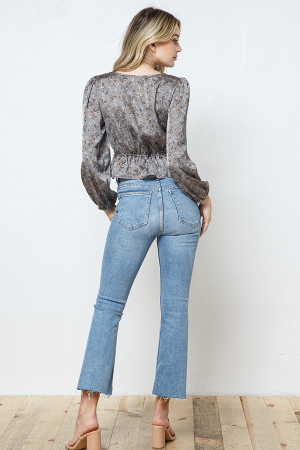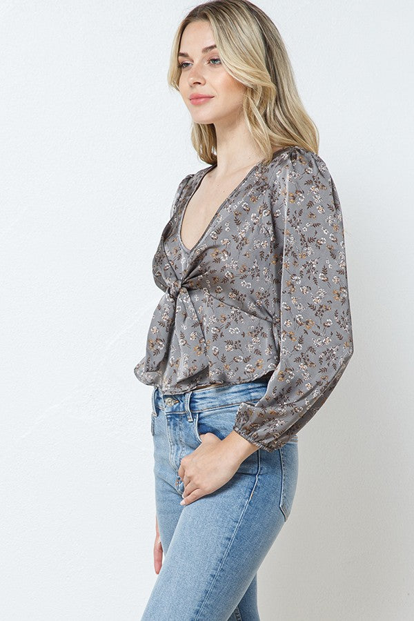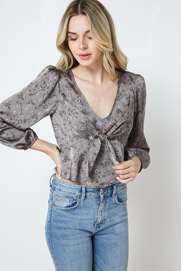 A floral satin top featuring front tie, cropped, v-neckline, elastic band at back, and long sleeve with elastic cuffs.