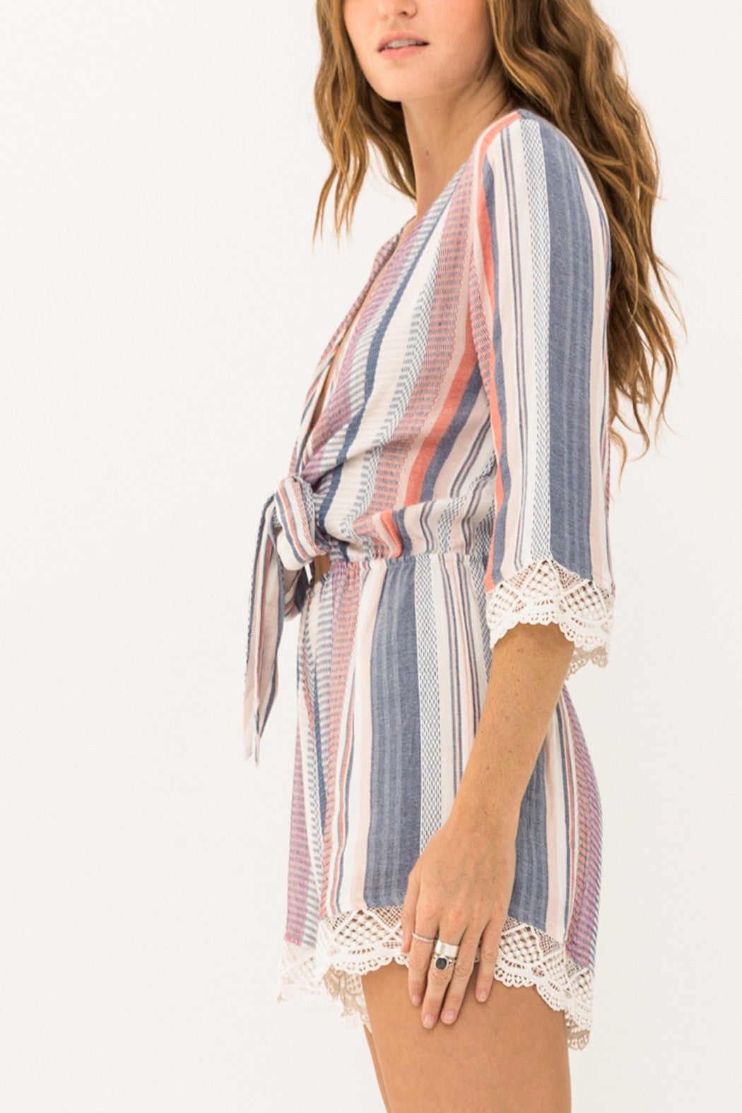 Front Tie Multi Stripe Romper Featuring Lace Details