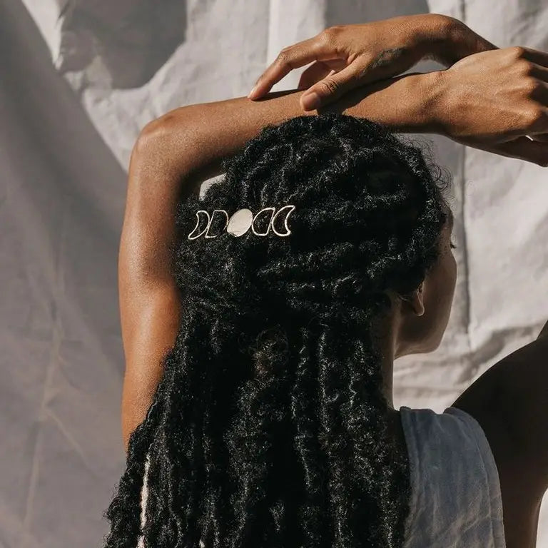 This unique, hand hammered barrette features an enchanting moon phase design in gold finish brass.