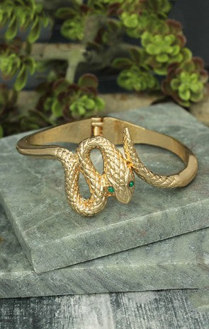 Glamorous gold snake slithers around your wrist in this classic cuff bracelet. Gold hinge cuff bracelet features snake wrap design with gold crystal eyes. * Mystical snake design * Made in China * Gold tone snake cuff bracelet