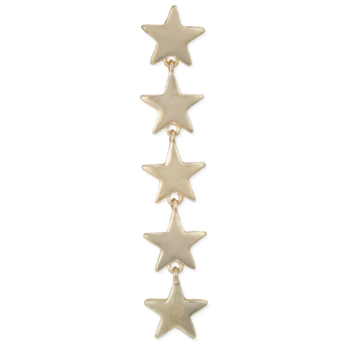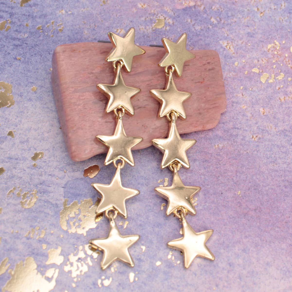 These celestial linear earrings earn five gold stars! Featuring a playful cascade of five golden stars, these earrings bring celestial vibes, retro glam, and a whole lot of sparkle to any look. Give stellar celestial vibes with these gold star post earrings.