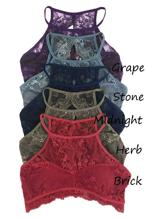 High-neck lace bralette, pull over with back hook closure, front keyhole detail, lined in the front shape as a bandeau, open back, and perfect amount of stretch.