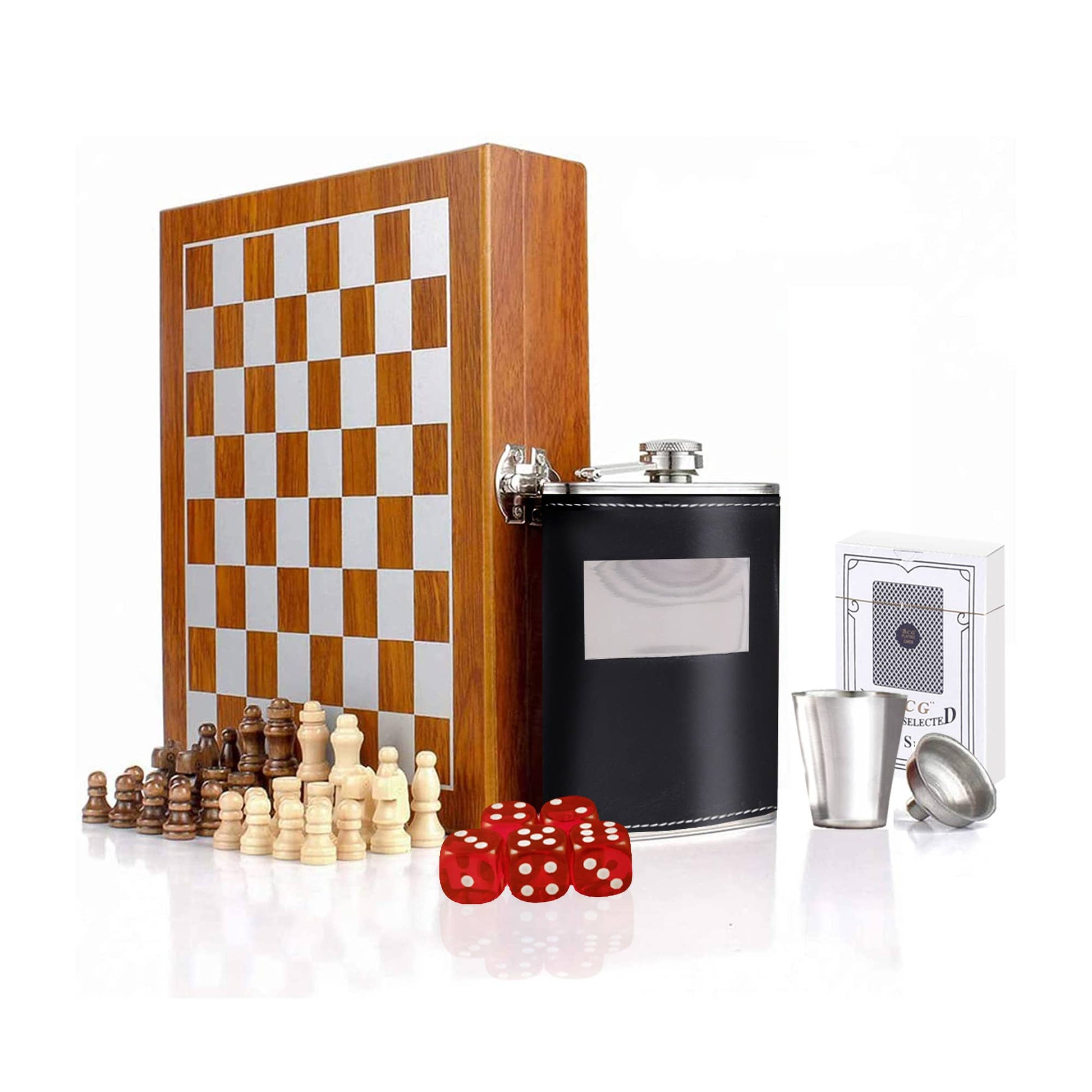 Games & drinks! The all in one, ultimate guy gift for any distinguished dude. Beautifully crafted wooden case features a chess board and when you open the box, find even more surprises! Packed with an entire chess set, handsome leather wrapped flask, stainless funnel for easy filling and shot glass. The games don't stop there though! Keep it going with the red dice set and deck of cards for night full of fun. Material: Wood/Acrylic/Stainless/Mad Made Leather. 9.5” X 7.5” X 2.5”.