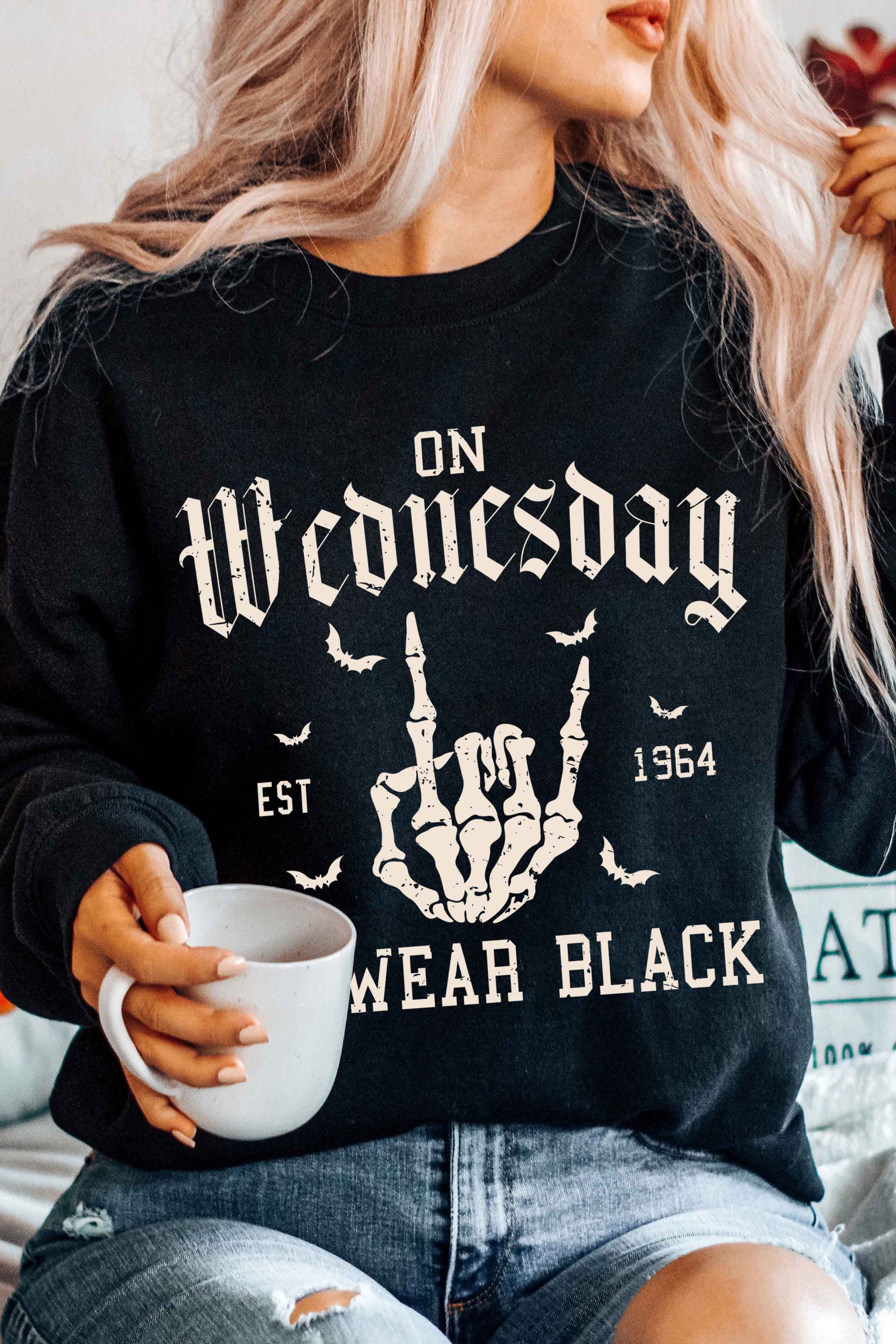 On Wednesday's We Wear Black Unisex Graphic Sweatshirt. Made with Air Jet Yarn for Softer Feel & Reduced Pilling.