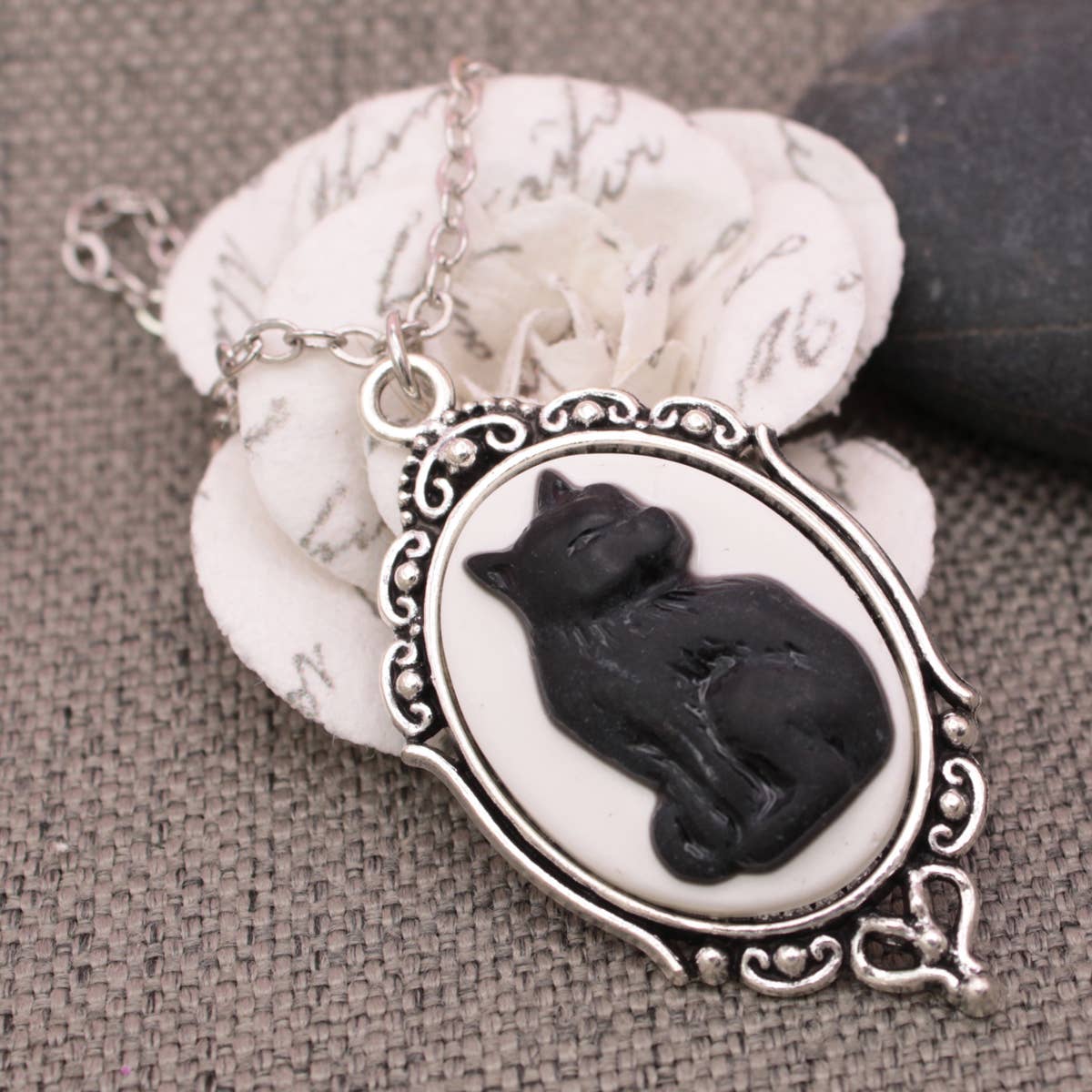 Add a touch of mysterious charm with this silver black cat cameo necklace. Featuring elegant vintage style frame and sleek black cat silhouettes, this furry friend necklace is the purrfect mix of gothic glam and feline flair. Whether you're casting spells or sipping tea, this necklace is all about enchanting style.