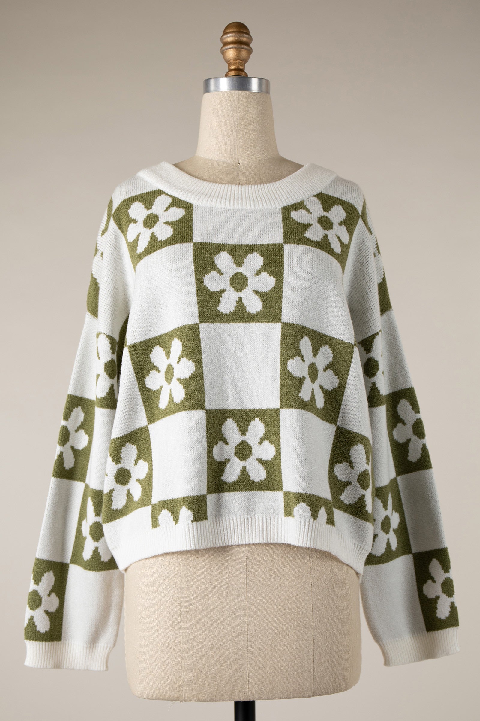 Soft Knit Retro Flower Checkered Print Pattern Sweater w/ a Ribbed Trim
