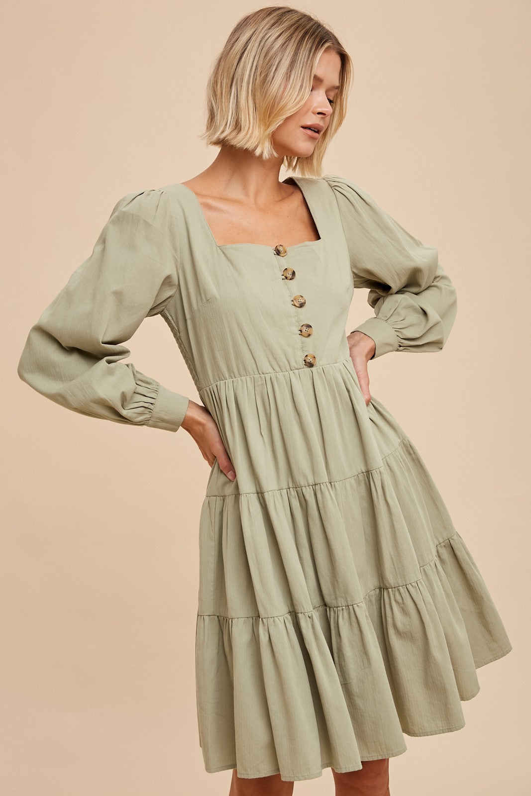 Tiered Square Neck Midi Dress w/ Tortoiseshell Buttons. Features Invisible Side Zipper.