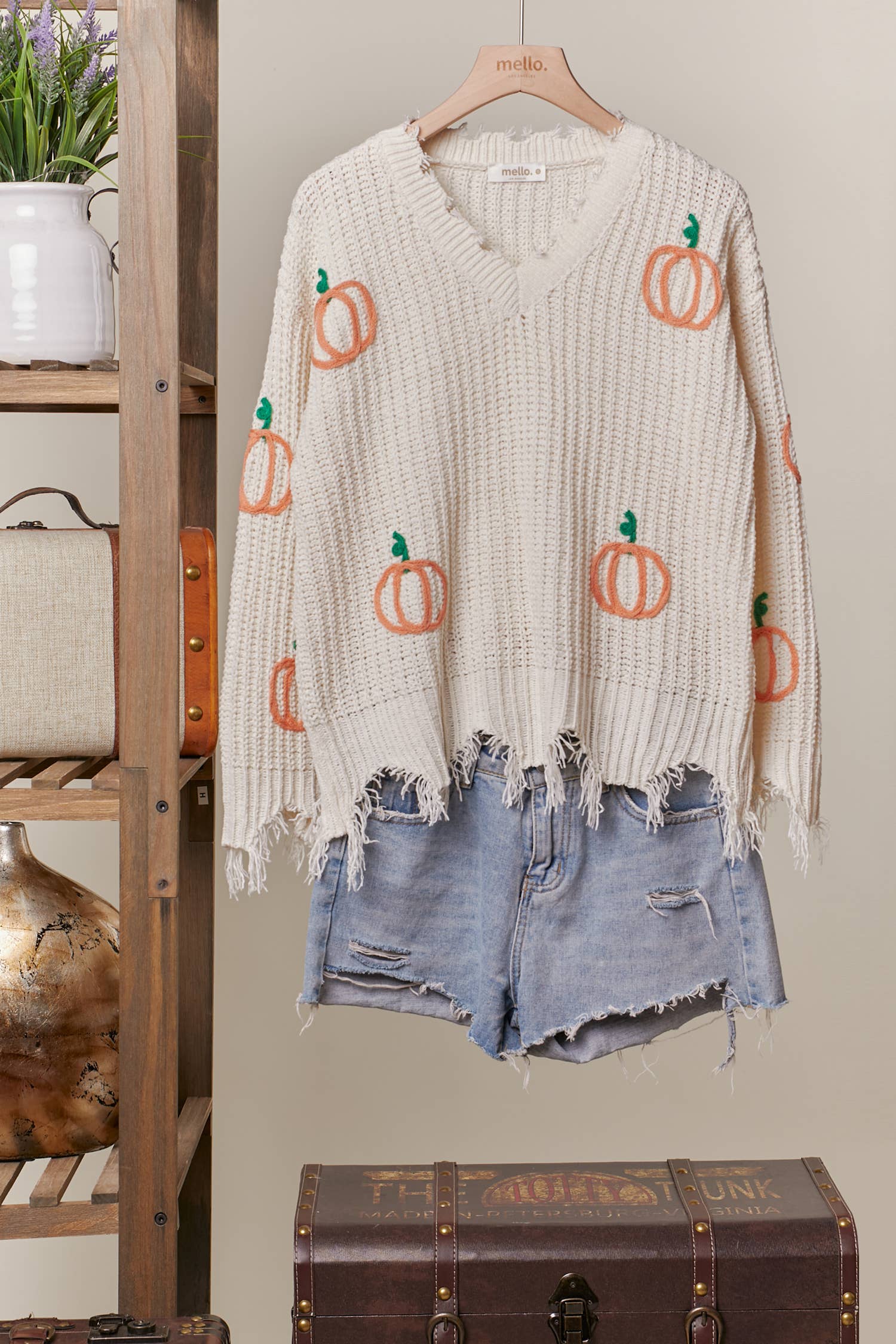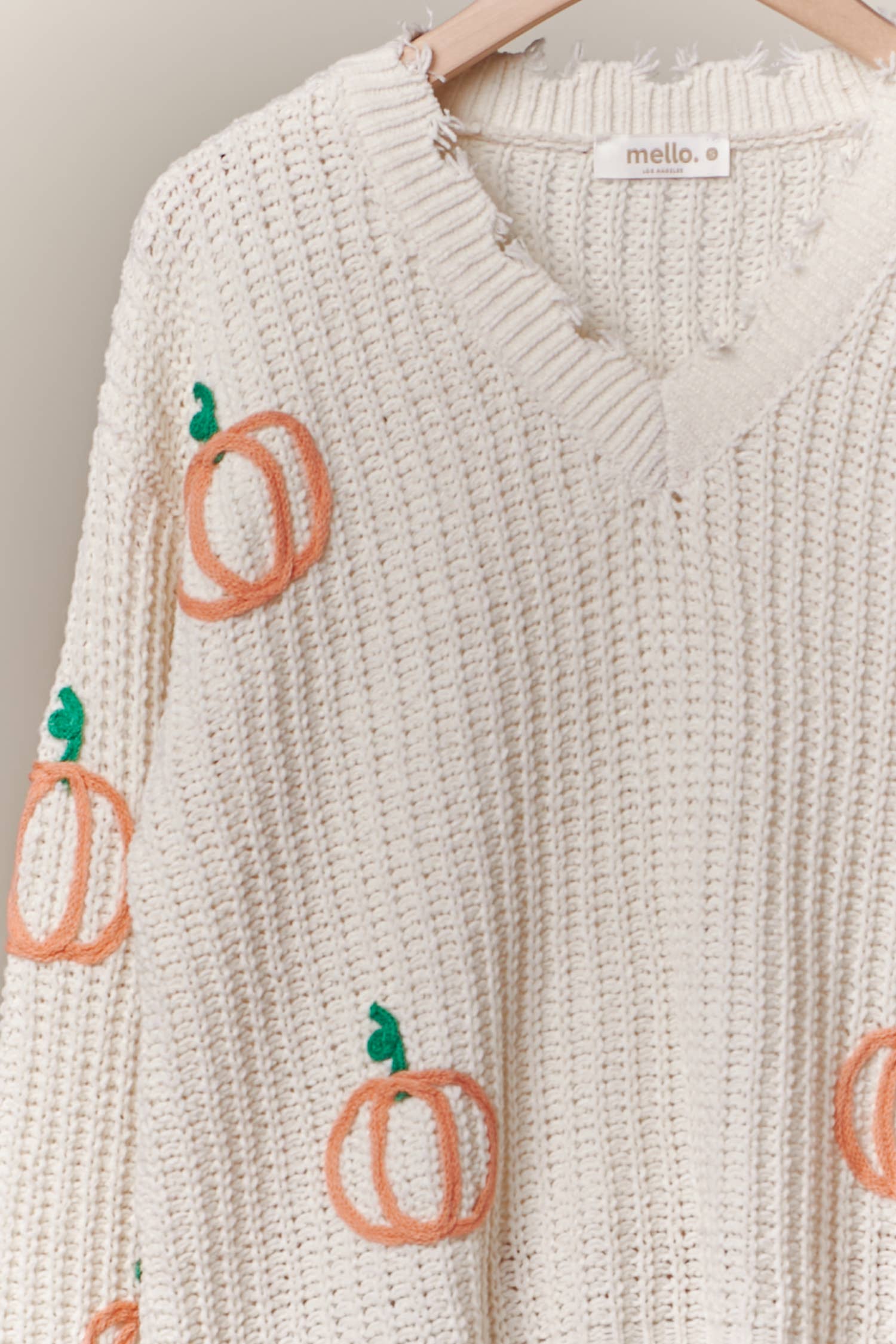 V-Neck Distressed Hem Sweater with Pumpkin Patch Design.
