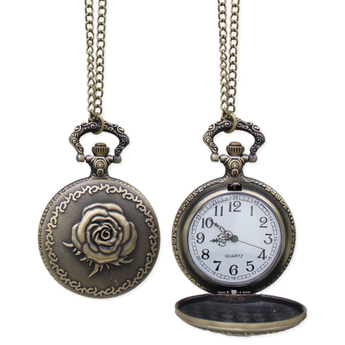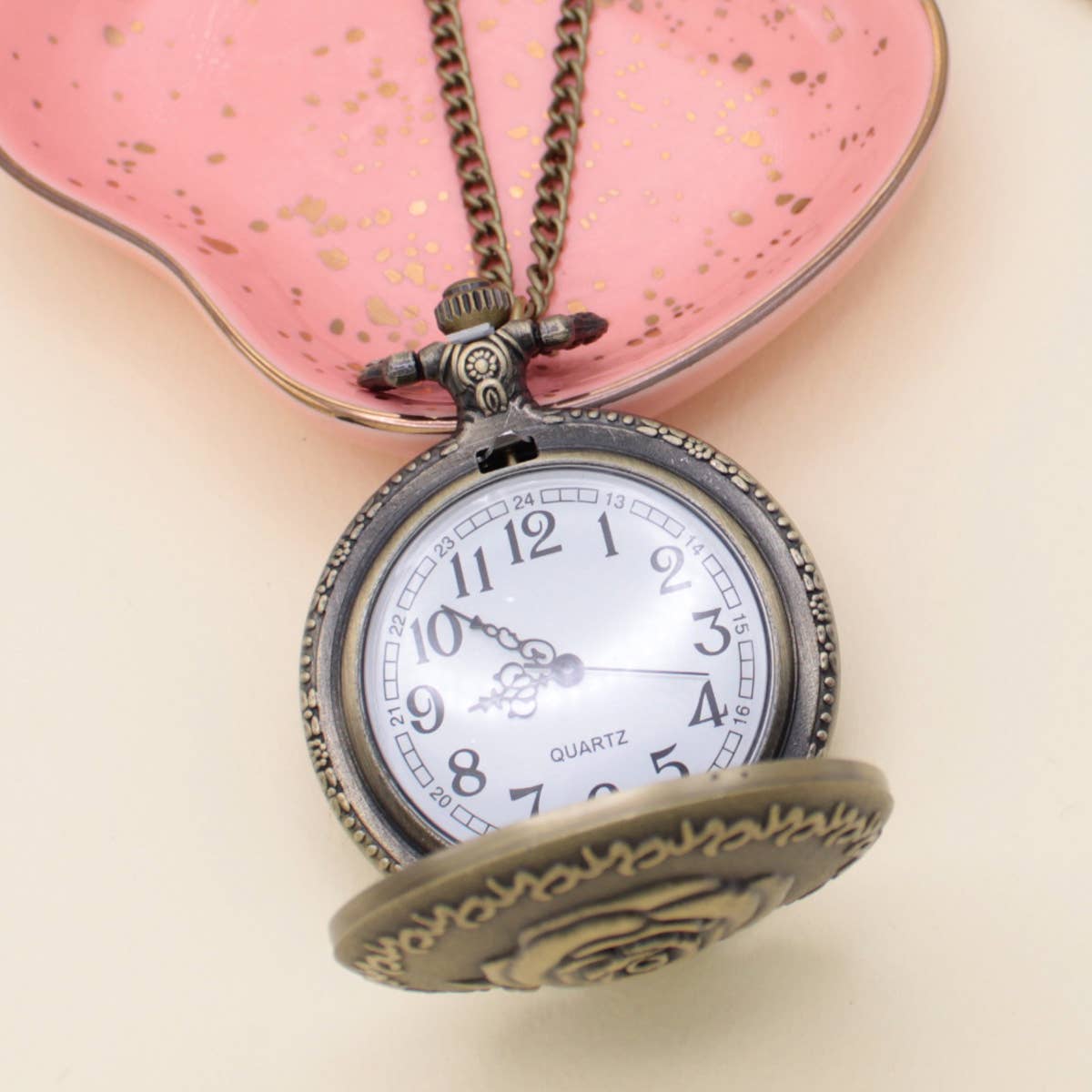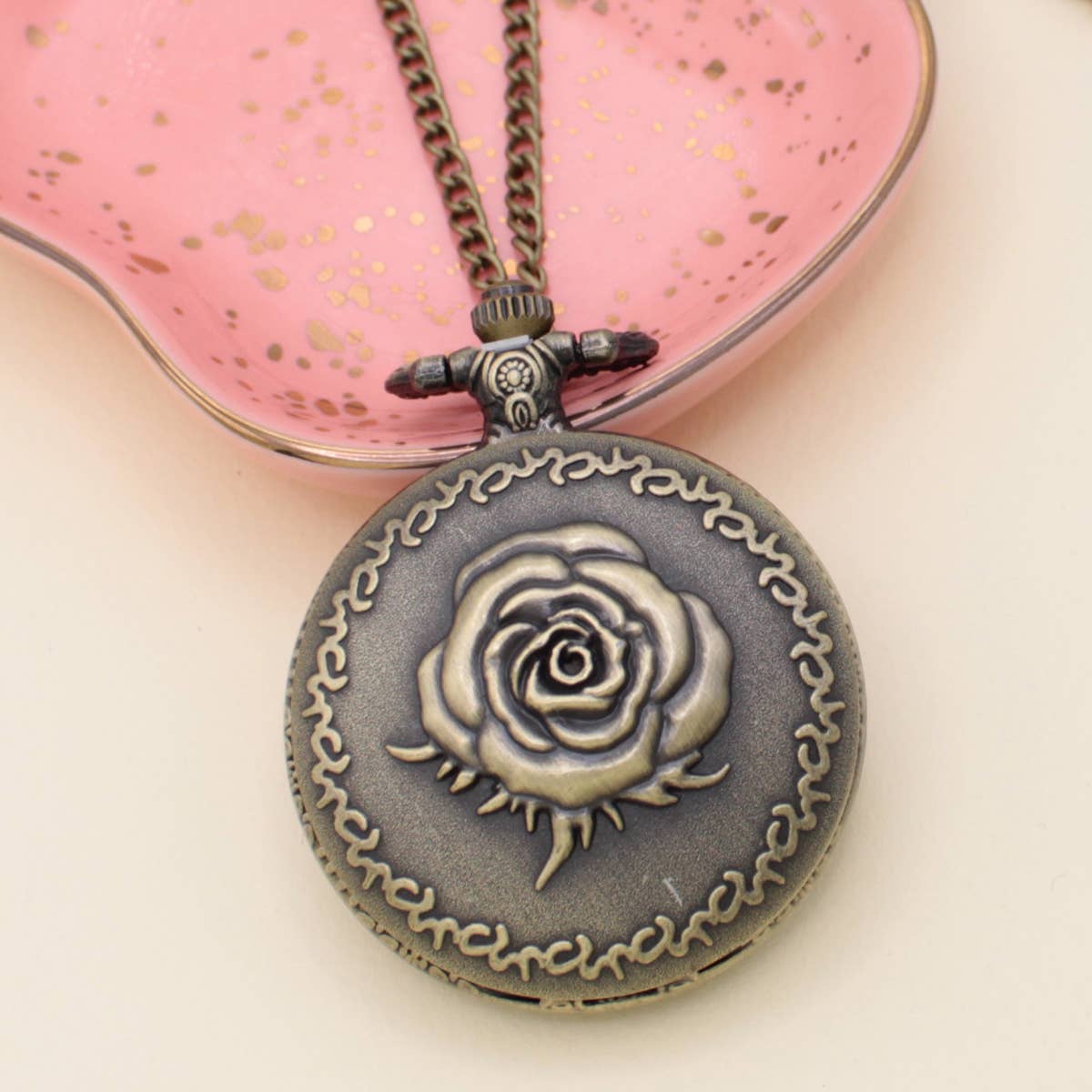 Discover timeless romance with the rose bud watch necklace, featuring antiqued gold and a blooming rose center. This pocket watch necklace opens to reveal not just the time, but a heart that yearns for everlasting beauty. Ideal for those who find love in every moment.